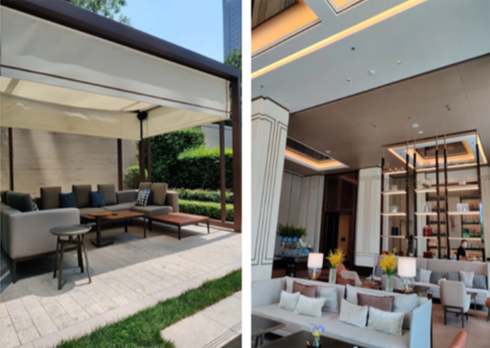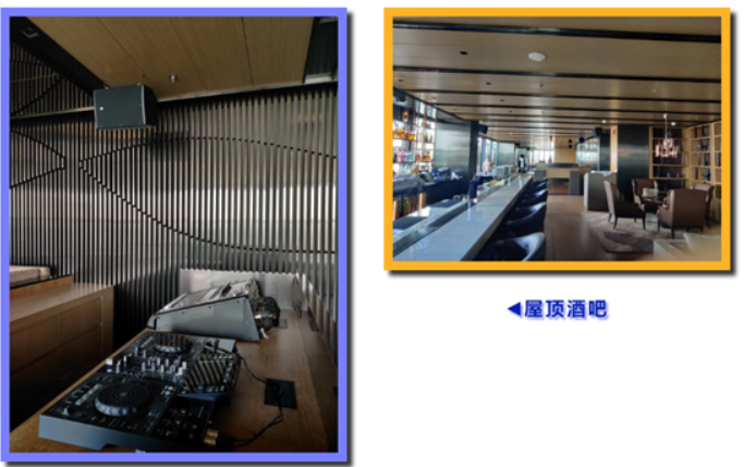 27樓屋頂酒吧Flair,分室內室外兩部分,配置DJ打碟機,主擴聲由EV SM係列全頻同軸+15寸超低音組成,室外視野極佳,就坐於池水邊。身邊綠植叢中隱藏的EV 8寸蘑菇音箱同步播放室內音樂,品美酒賞夜景甚為愜意,開業即成為高新區的一個新的網紅打卡地。