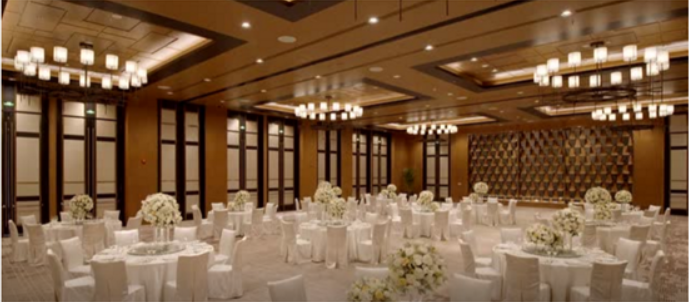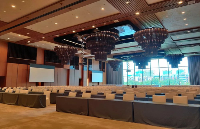 酒店的大宴會廳位於酒店二樓,場地麵積1100平米,層高8米。現場擴聲采用了EV的12寸吸頂音箱,均勻的聲場分布,充足的聲壓級,讓大宴會廳舉辦的活動,無論是會議還是宴會,擴聲都得到了保證。因為場地天花內設備管道眾多,施工時使用了更薄的方形箱體,在不破壞裝修的情況下,節省了空間,更加的美觀。